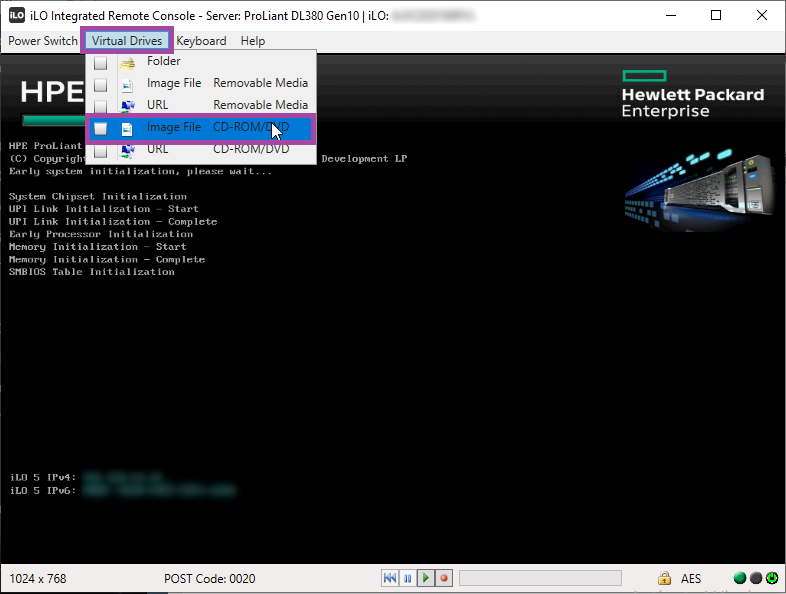 برای انجام این کار میتوانیم فایل ایزو SPP را با استفاده از ابزار HPE USB Key Utility روی حافظه فلش بوت کنیم یا این که به صورت شکل زیر با استفاده از iLO فایل ایزو را مونت کنیم: