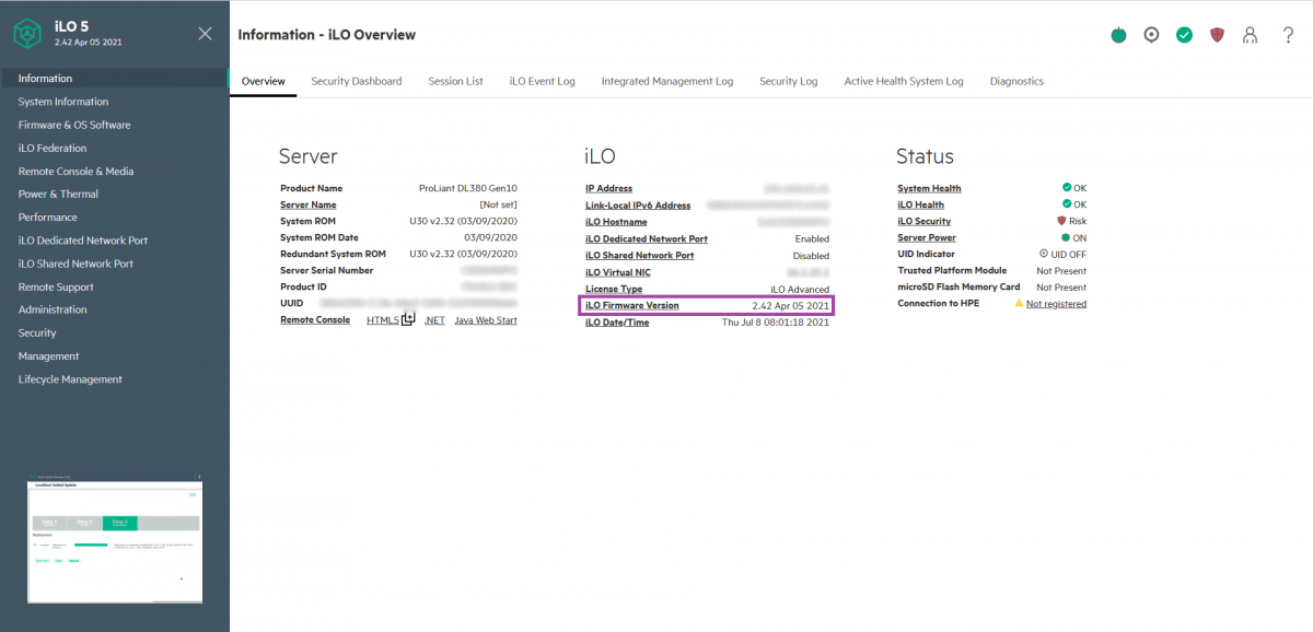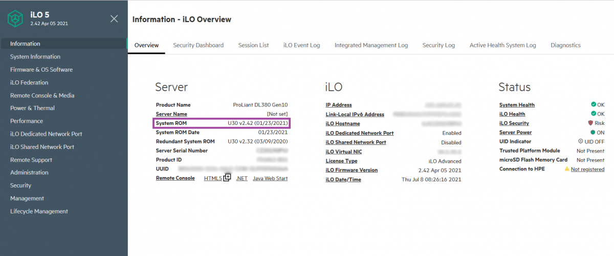 قبل از بروزرسانی فریمور سرور، نسخه System ROM و همچنین iLO Firmware را مطابق شکل زیر از قسمت Information میتوانیم مشاهده کنیم:
